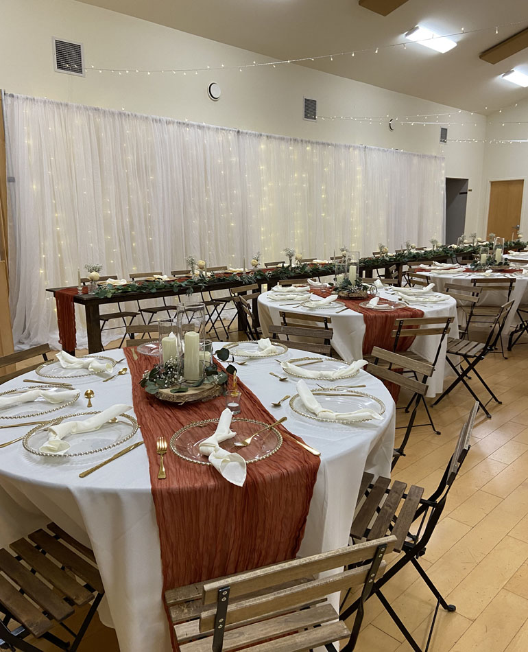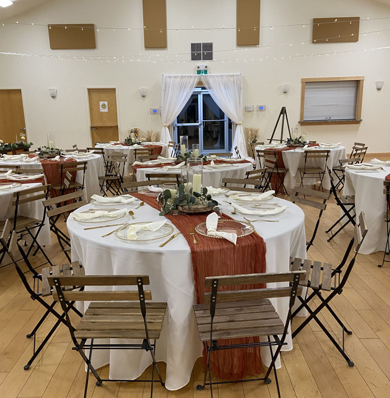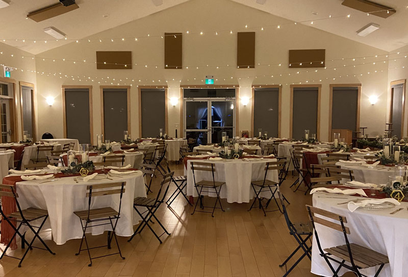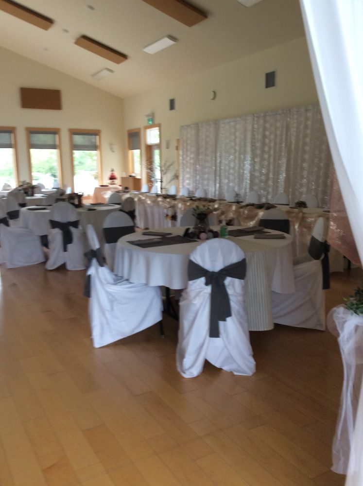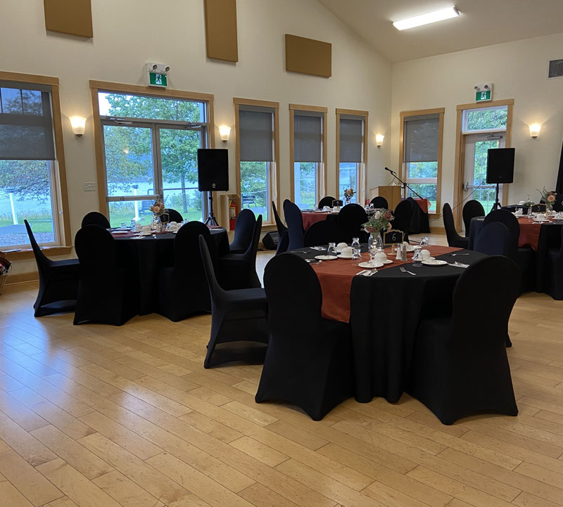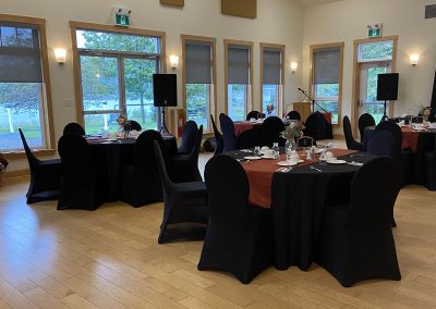- Tables including table linens, chairs, podium, sound system, and projector